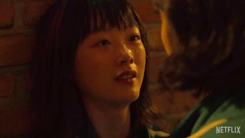 Ji-yeong from Squid Game smiles, dreaming of Jeju Island, with a Netflix logo visible.