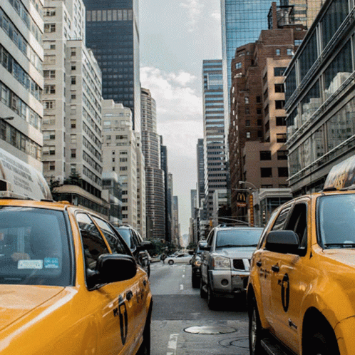 A call to action to vote, displayed over a busy New York City street scene with iconic yellow cabs.