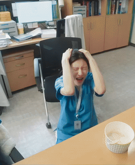 Actress Go Youn Jung (고윤정) in scrubs, expressing extreme distress and screaming in an office setting.