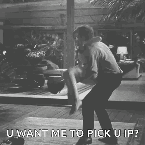 A man romantically picks up a woman, with the caption 'U want me to pick u up?' in a black and white scene.