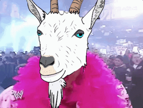A cartoon goat wearing a pink feather boa and 'Nature Boy' cape appears in a wrestling arena, representing Goattribe WWG.