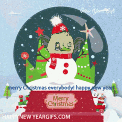 A festive Goblintown Goblin snowman wishes 'Merry Christmas everybody! Happy New Year!' in a holiday animation.