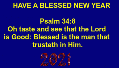 A message wishing a blessed New Year 2021, featuring Psalm 34:8 on a blue background.