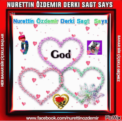 Animated hearts with 'Bless', 'God', and 'You' messages, featuring Nurettin Özdemir's name and Turkish spring quotes.