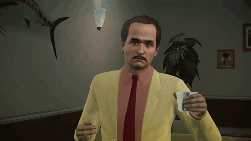 Fredo Corleone from The Godfather raises a glass and drinks, offering a salute in a stylized scene.
