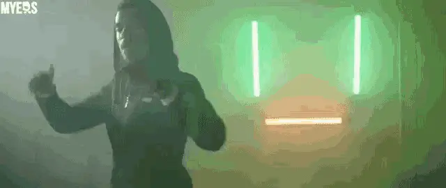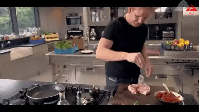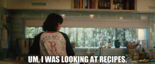 a woman standing in a kitchen with the words um i was looking at recipes below her