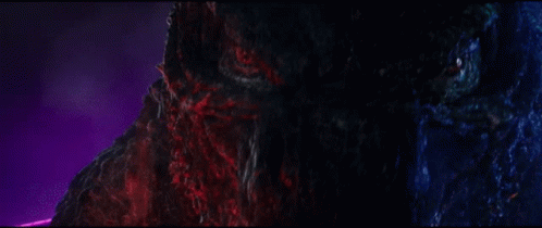 Close-up of Godzilla roaring intensely with dramatic purple and red lighting in a dark environment.