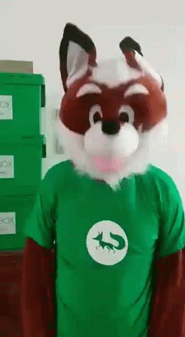 A person in a Gofoxbox fox mascot costume wearing a green shirt with a fox logo.