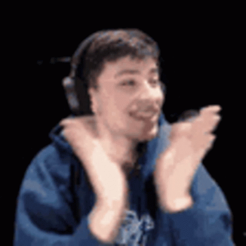 Gogy, also known as GeorgeNotFound, laughing and clapping while wearing headphones and a blue hoodie.