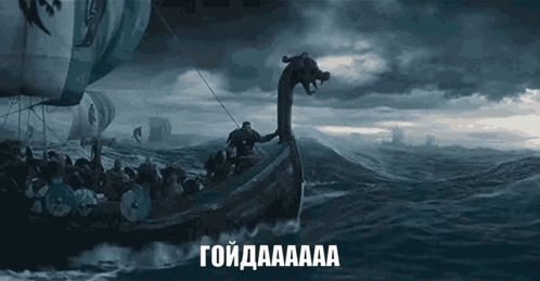 Epic Viking drakkar sailing through stormy seas with a warrior at the helm, accompanied by the cry 'GOYDAAAAAA'.