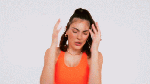 Evie Irie in an orange top, energetically moving her hands around her head, expressing a 'going crazy' vibe.