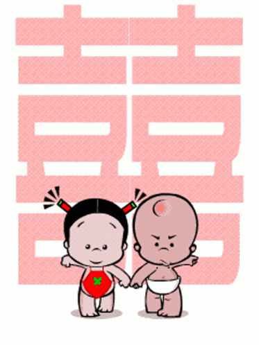 Two adorable Pobaby cartoon babies holding hands in front of a pink double happiness symbol, representing good fortune.