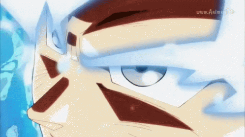 Close-up of Goku's face in his powerful Ultra Instinct form from Dragon Ball Super, with www.anime.tv visible.