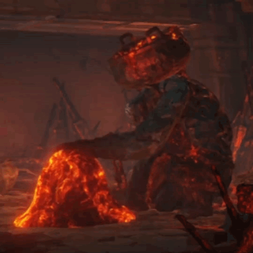 A Golem Smith gently pets a living magma lava blob slime in the game Elden Ring, a wholesome moment.