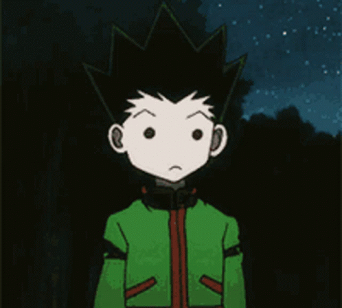 Gon Freecss from Hunter x Hunter, wearing a green jacket, blinks and looks around.