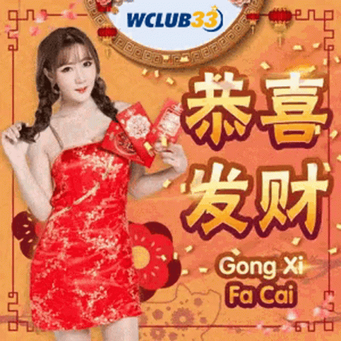 Festive Wclub33 Chinese New Year promotion featuring a woman in a red dress holding angpao, wishing Gong Xi Fa Cai.