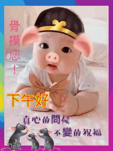 A cute baby wearing a pig hat and a bow, with a 'Good Afternoon' greeting and animated rats.