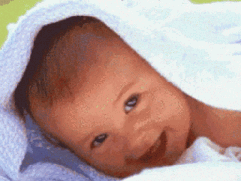 An adorable baby wrapped in a soft white blanket smiles sweetly, looking up at the camera with bright blue eyes.