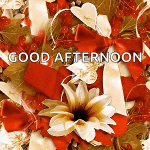 A vibrant good afternoon greeting featuring red bows, berries, hearts, and a beautiful flower.