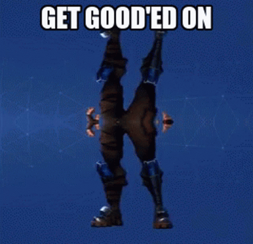 A Fortnite character performs the Default Dance upside down with the text "GET GOOD'ED ON" displayed above.