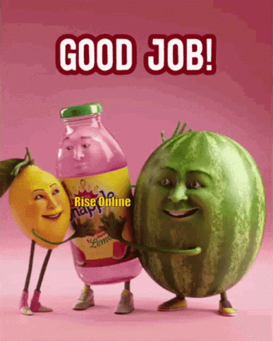 Animated lemon, watermelon, and Rise Online bottle celebrate with 'Good Job!' text.