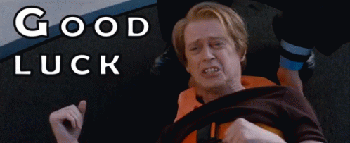 Steve Buscemi lying on the ground, looking distressed, with the text 'GOOD LUCK' behind him.