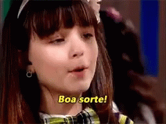 Maria Joaquina, played by Larissa Manoela, cheerfully wishes 'Boa sorte!' (Good luck!).