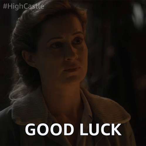 A woman from The Man in the High Castle says 'Good Luck' in a dimly lit setting.