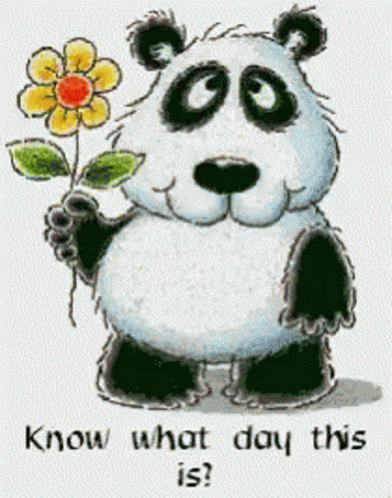 Cute panda holding a flower delivers a cheerful 'Good Morning' message, asking 'Know what day this is?'
