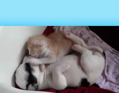A sweet kitten and puppy cuddling together, with a 'Good morning baby!' caption. Adorable animal friends.