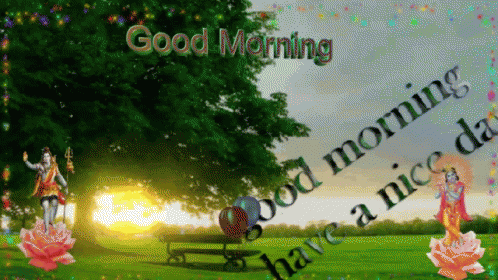 A cheerful good morning message featuring animated balloons, a serene tree, and a bench, wishing you a nice day.