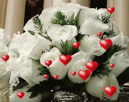 A collection of beautiful flower bouquets, including white, red, pink, and yellow roses, adorned with animated red hearts.