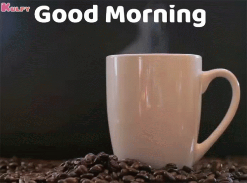 Steaming cup of coffee surrounded by coffee beans with a 'Good Morning' message, perfect for morning wishes.