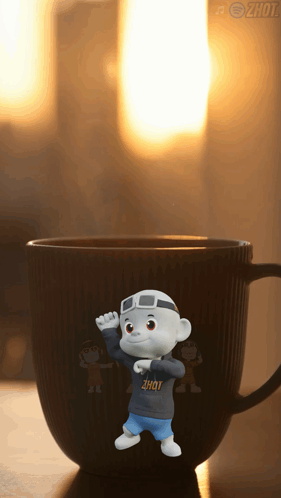 A cute Zhot character dances on a steaming coffee mug, spreading good morning vibes with the song 'Rise & Repeat'.