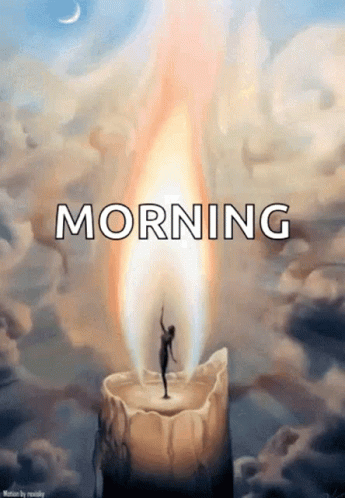 An artistic image depicts a woman standing on a burning candle, accompanied by the text 'MORNING' for a greeting.