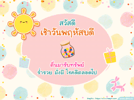 Animated Thai greeting card for a happy Thursday morning, featuring a smiling sun, candy jar, and gifts.