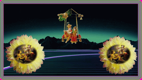 Animated greeting featuring Lord Krishna and Radha on a swing, surrounded by vibrant flowers and devotional text.