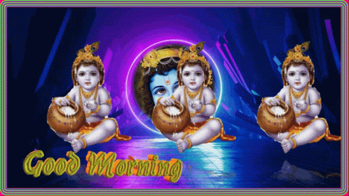 A vibrant good morning greeting featuring multiple images of Baby Krishna holding butter pots.
