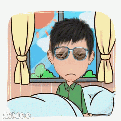 Cartoon character Jwu (Santosh) wakes up, yawning and stretching in bed, greeting the morning.