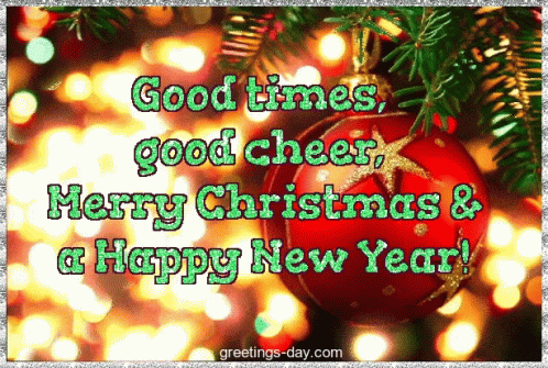 A festive Christmas and New Year greeting card featuring the message 'Good times, good cheer, Merry Christmas & a Happy New Year!'