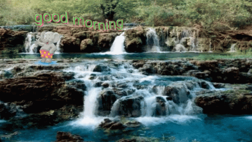 Animated scene of a cartoon elephant surfing on a mini waterfall with a 'Good Morning' message.