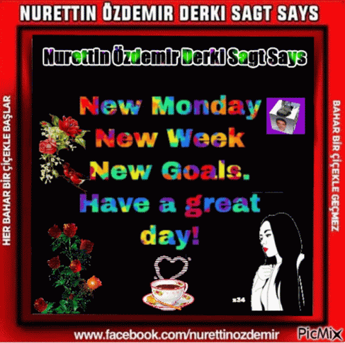 Nurettin Özdemir shares a vibrant 'New Monday, New Week, New Goals' greeting with flowers and coffee.
