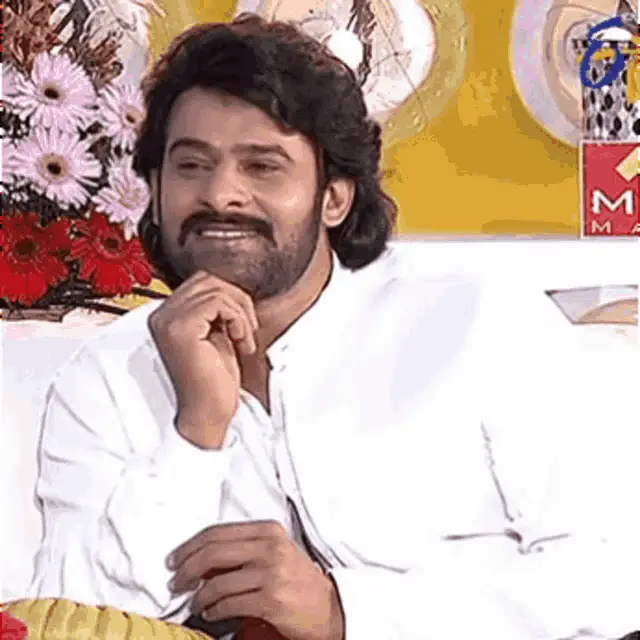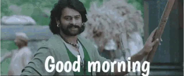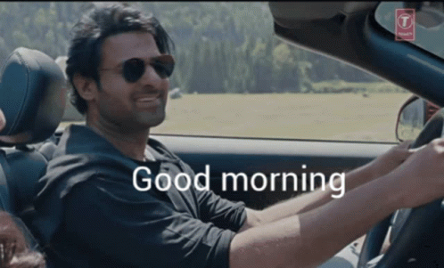 Prabhas smiles while driving a convertible car with a 'Good morning' message overlaid.