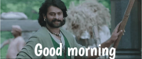 Prabhas from Bahubali wishes 'Good morning' with a smile, holding a wooden stick.