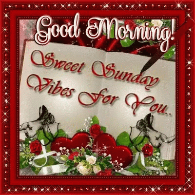 Animated greeting card wishing 'Good Morning! Sweet Sunday Vibes For You..' with hearts, roses, and a quill pen.