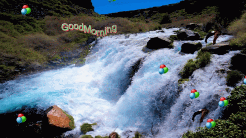 Beautiful waterfall scene with colorful balloons, flying birds, and a 'Good Morning' message.