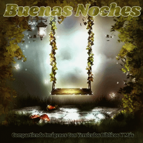 A serene image featuring a swing adorned with glitter and a lamp, displaying 'Buenas Noches' text.