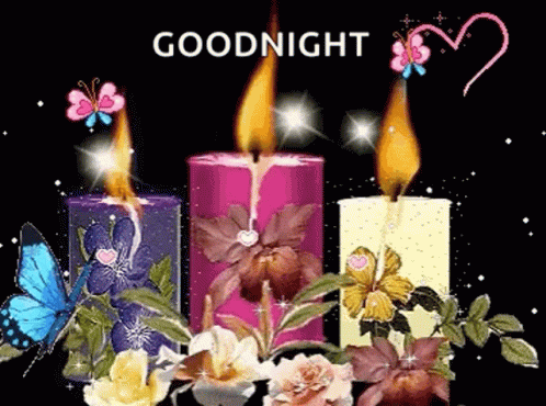 Three glowing candles, adorned with flowers and butterflies, convey a warm 'Good Night' message.