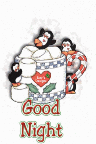 Cute penguins gather around a festive mug of marshmallows with a candy cane handle, wishing 'Good Night'.