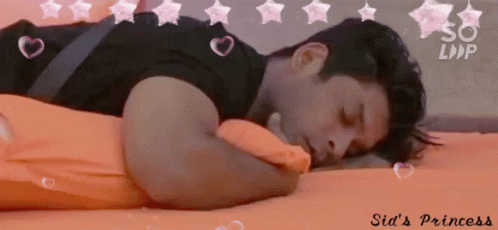 Sidharth Shukla sleeping peacefully on a bed, surrounded by animated stars and hearts.
